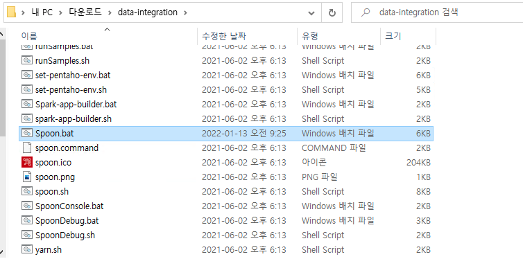 이제 1번 Step에서 압축푼 폴더로 이동해보면 Spoon.bat 파일을 실행하여 pentaho 프로그램을 기동한다.