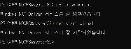2. 명령어 입력 (winnat 서비스 종료 후 재기동)