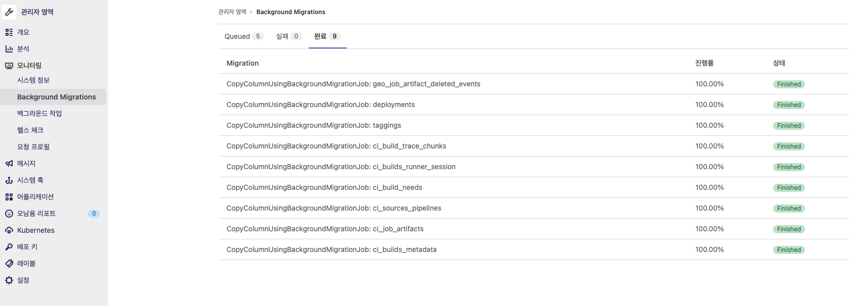 2. 상단 메뉴 -> 관리자 -> 관리자 영역의 모니터링 탭 -> Background Migration 메뉴 클릭