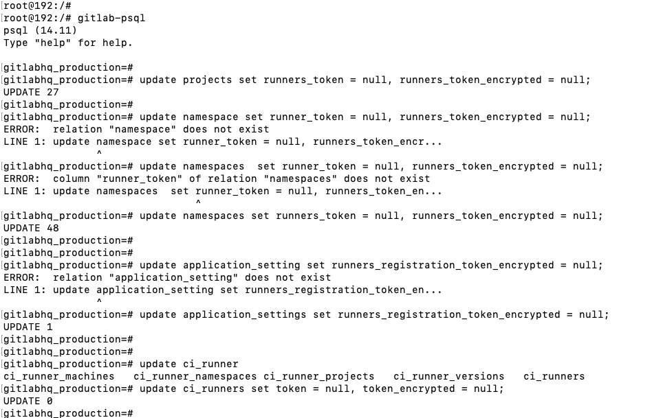 위의 에러는 Gitlab이 사용하는 PostgreSQL의 테이블들에 기록된 Token 값들을 삭제해주면 된다.