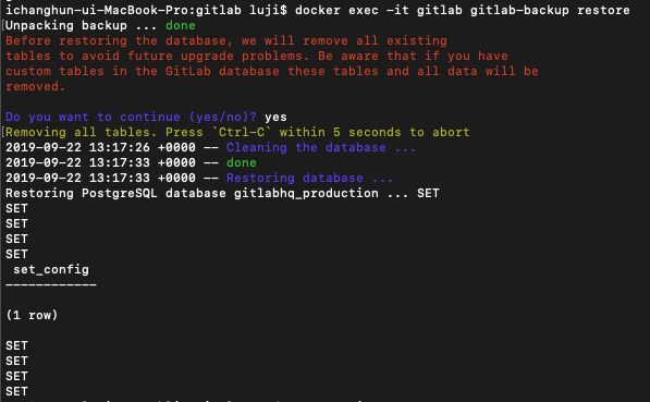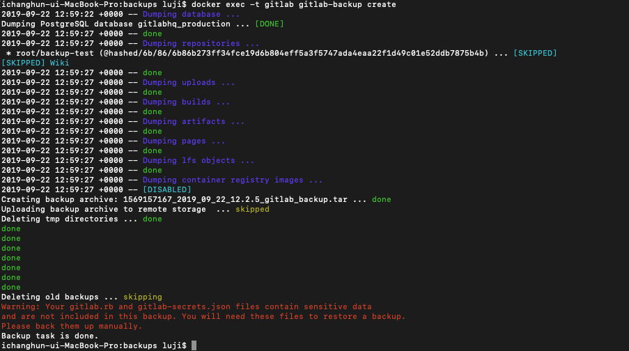 $ docker exec -t <컨테이너 이름> gitlab-backup create