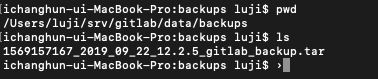 나같은 경우엔 볼륨 경로는 /Users/luji/srv/gitlab/.. 으로 잡아 두었기 때문에 백업파일의 생성 경로는 /Users/luji/srv/gitlab/data/backups 디렉토리에 저장되었다. 생성된 파일명은 ~~_gitlab_backup.tar으로 tar압축파일이 생성된다. 이제 이 tar파일을 따로 저장하여 백업하고자하는 머신으로 파일을 옮긴다.