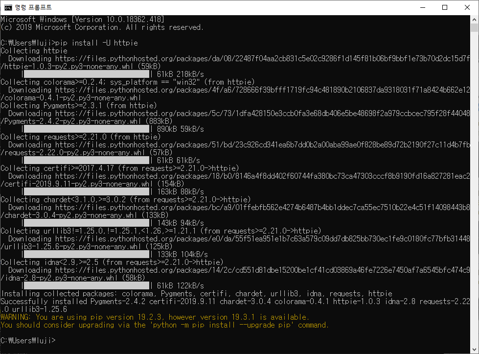 보통 리눅스나 맥에선 yum, apt, brew로 httpie를 땡겨오면 설치가 되지만 윈도우에선 파이선을 설치하여 pip로 설치해야한다. (https://httpie.org/doc#installation)