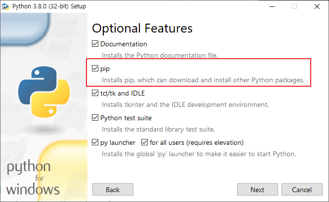 선택 옵션에서 pip 기능 체크후 설치를 진행한다.